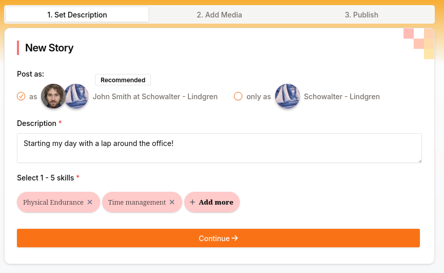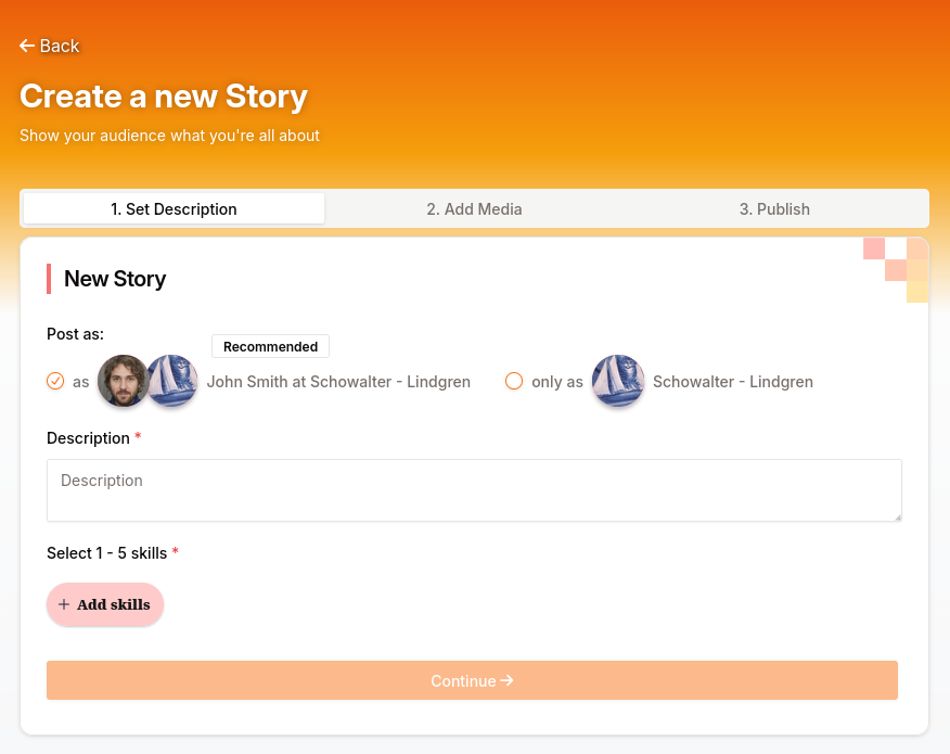On Slip, it is possible to post a Story in three modes: as yourself, as your company, or as yourself at your company. Users visiting the corresponding profile will find all posted Stories in the profile's Story Gallery. More about this will follow in the section “Creating a new Story".