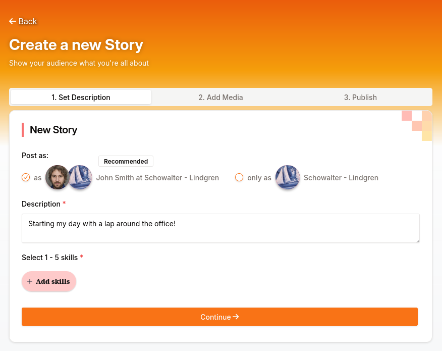 First, select as who you want to post the Story. It is recommended to post as yourself at your company, so that the Story is tied to your company profile while keeping a personal touch.