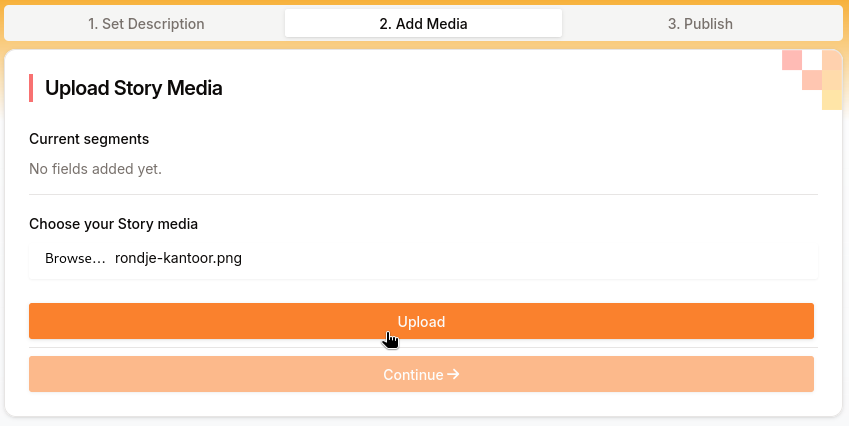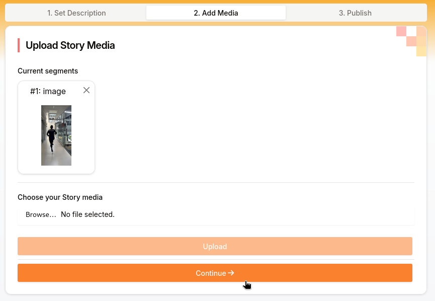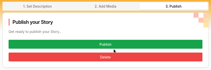 On the next page, you'll see the Story creator with three steps to follow, and a in-app preview of the soon to be posted Story. The preview will update as you go.