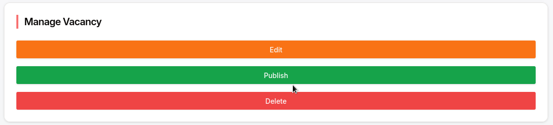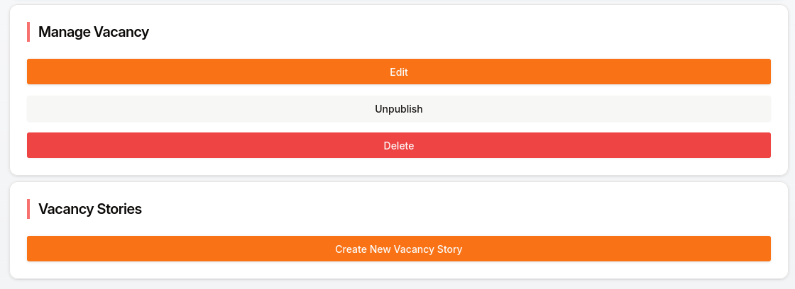 Before the Vacancy is visible to users on our platform (and before it can be used for Vacancy Stories), it needs to be published. Click the “Publish” button in the “Manage Vacancy” panel:
