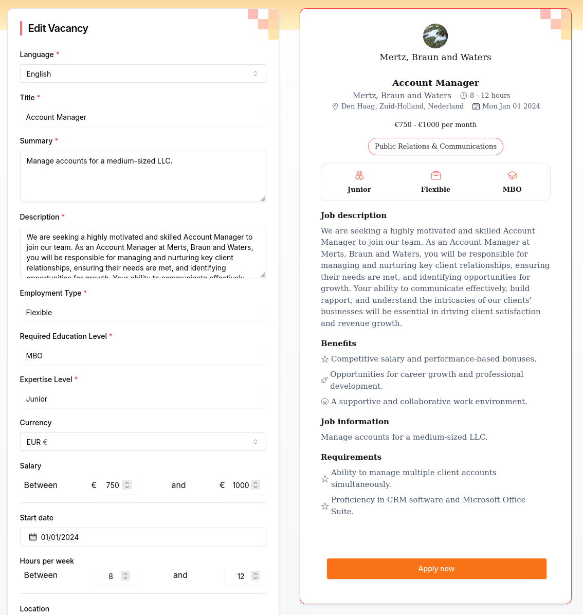 When you're done filling in the details, hit “Create Draft Vacancy” to create the new vacancy. You will be taken to the vacancy management. Here, you'll be able to publish the vacancy and (optionally) create vacancy stories.