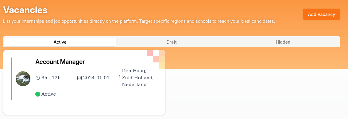 Congratulations, your vacancy has now been published! It should now also show up in the “Active” section of the Vacancy Overview.